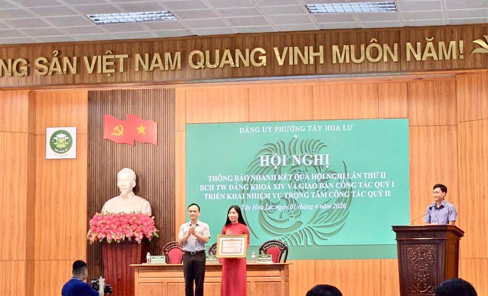 Tại hội nghị, đồng chí Cao Trường Sơn – Tỉnh ủy viên, Bí thư Đảng ủy, Chủ tịch Hội đồng nhân dân phường – đã trực tiếp trao Bằng khen và chúc mừng cô giáo. Đây không chỉ là niềm vinh dự của cá nhân cô Dương mà còn là niềm tự hào của tập thể chi bộ Trường THCS Ninh Giang.