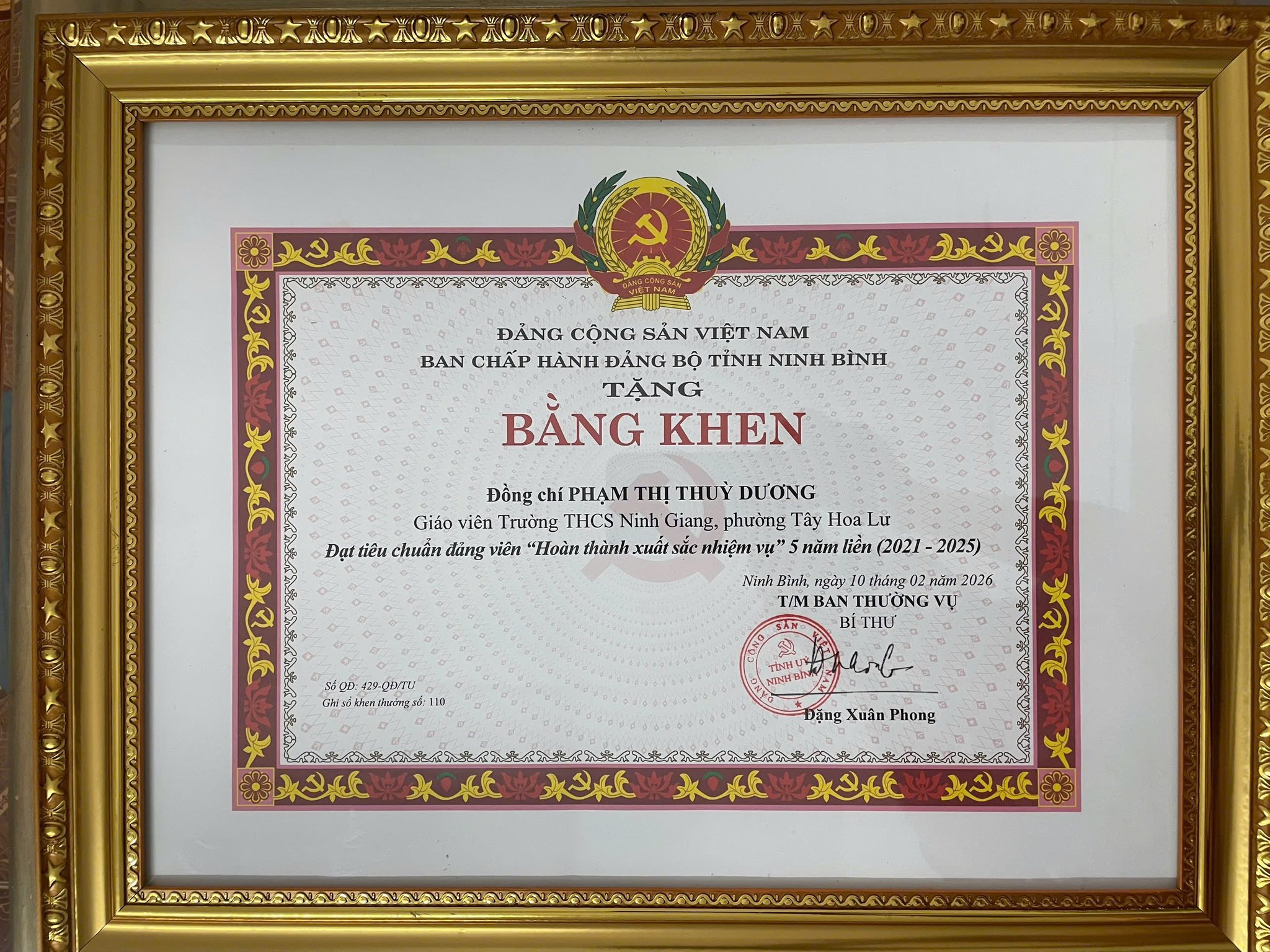 Cô giáo Phạm Thị Thùy Dương vinh dự nhận Bằng khen của Tỉnh ủy – Đảng viên hoàn thành xuất sắc nhiệm vụ 5 năm liền(2021-2025)